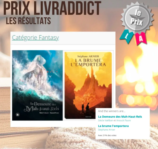 La Brume l’emportera remporte le Prix Livraddict 2025 catégorie fantasy, en compagnie de La Demeure des Mah-Haut-Rels. [En savoir plus]