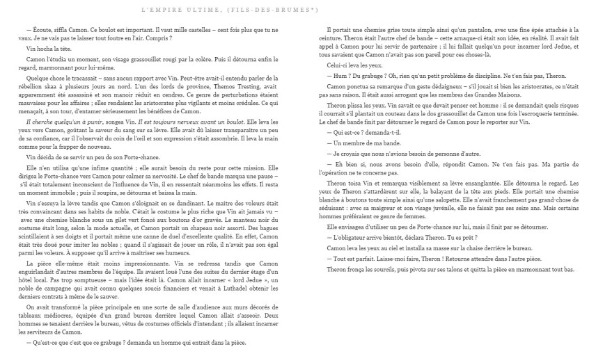 - Les capacités « spéciales » de Vin. Sanderson affronte un vrai obstacle dans ce début de roman : Vin dispose d’un pouvoir surnaturel dont elle n’a pas vraiment conscience. Elle est capable de faire « des trucs », mais pour elle ce n’est qu’une sorte de superstition, un ressenti instinctif, et elle ne sait pas trop ce qu’elle fait ni comment cela fonctionne. Ainsi, décrire au lecteur l’usage de ce pouvoir est compliqué pour Sanderson à ce stade, car « il n’a pas le droit » de nous dire des choses que Vin ignore ; or, elle ignore beaucoup. Il est obligé de nous le décrire comme le pense Vin, avec cette histoire de « porte-chance », c’est-à-dire de façon assez abstraite (la découverte et la maîtrise évolutive de ses pouvoirs font partie du « jeu » de la narration de cette série). En pratique, Sanderson conserve donc strictement sa focalisation, écrit le passage comme le pense l’héroïne, et compte sur le lecteur pour s’accrocher un peu et patienter pour avoir d’autres indices sur le fonctionnement des étranges capacités de Vin.