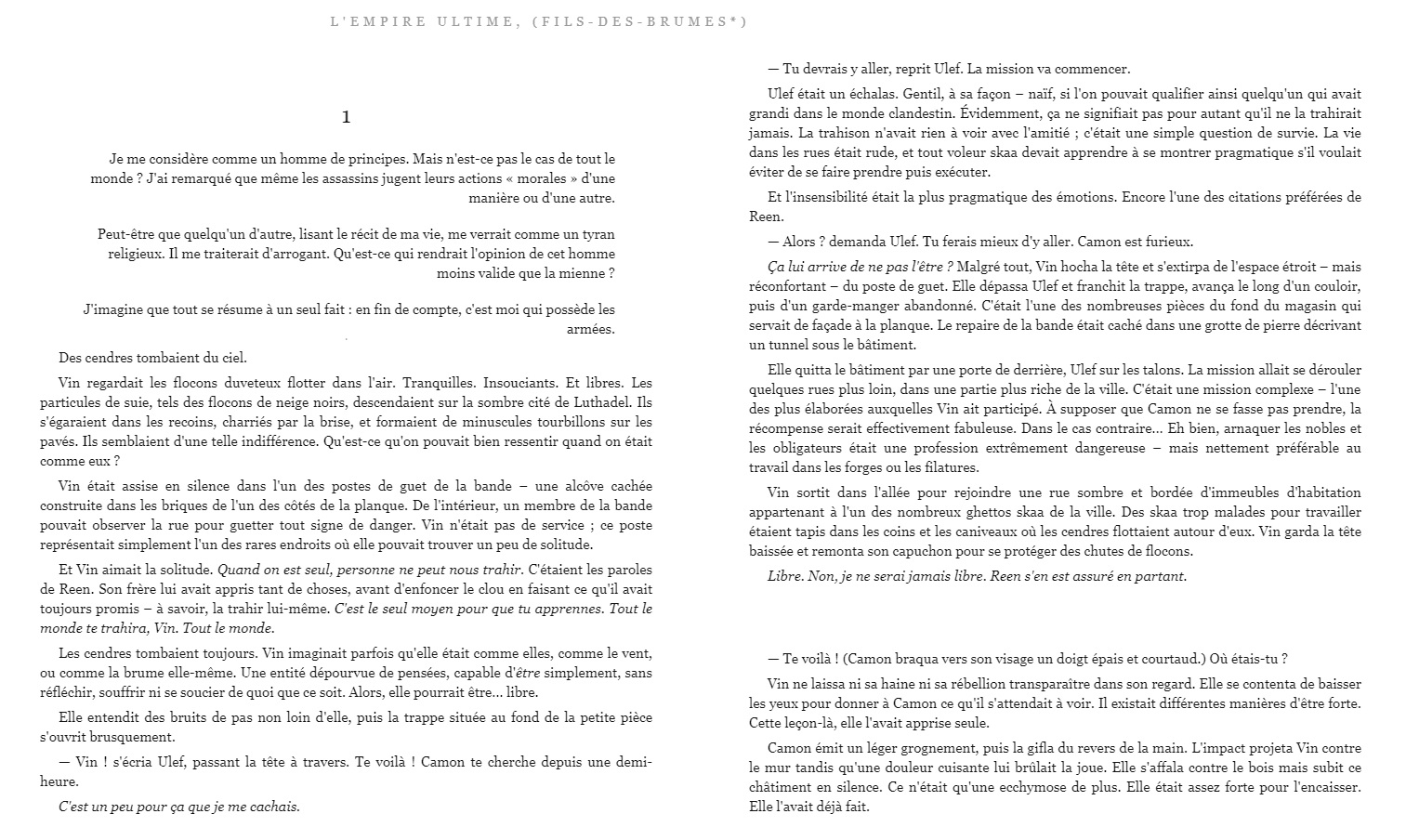 À part cela, amuse-toi à lister le nombre invraisemblable d’informations transmises au lecteur sur le monde en seulement quatre pages, seulement en suivant les pensées du personnage sur ces courtes scènes. En quatre pages nous avons un cadre général (une cité sombre et brumeuse où il pleut des cendres, une opposition entre noblesse et gens des rues), un contexte resserré (le personnage fait partie d’une bande de voleurs et s’apprête à participer à une grosse arnaque juteuse mais très risquée) et une thématique (le personnage est solitaire, n’a confiance en personne, a été trahie par son propre frère, et une thématique du livre sera vraisemblablement liée à ça). Comme quoi, la façon de réaliser l’exposition est fortement influencée par la narration choisie, mais on peut très bien exposer de nombreuses choses quelle que soit celle que l’on utilise : aussi bien Jaworski, Bardas que Sanderson parviennent à nous fournir énormément d’informations en quatre pages, chacun à sa façon en respectant « sa » narration.