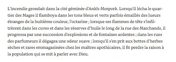 L’omniscient facilite aussi l’exposition : mine de rien, sous couvert de nous raconter la catastrophe qui s’empare de la ville d’Ankh, as-tu remarqué que Pratchett y glisse des éléments de description ? Il ne nous balance pas un gros paragraphe façon « Ankh ressemblait à » mais – en faisant le récit de ce qu’il s’y passe –, il nous fait déjà visualiser une ville jumelle, plusieurs quartiers, un fleuve central, des ponts, une répartition sociale (avec les riches d’un côté qui tentent d’abattre les ponts quand l’incendie les menace), un niveau technologique, etc. Il s’avère en réalité que ce premier chapitre est une sorte de flashforward : le livre va ensuite nous raconter les événements qui sont arrivés quelques jours plus tôt et qui ont mené à la catastrophe. L’ironie dramatique est à son comble, puisque le lecteur sait déjà que le personnage de Deuxfleurs va être le responsable de l’anéantissement de la ville.