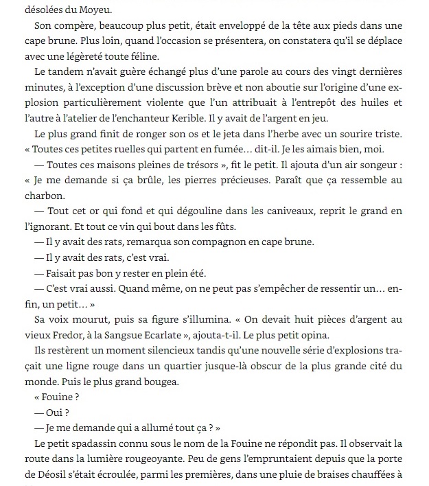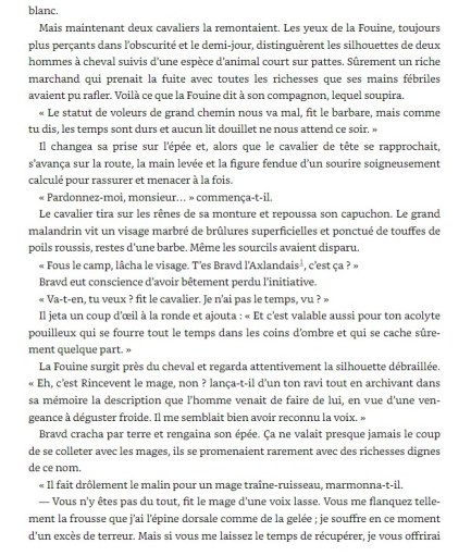 Autre indice enfin, quand les personnages entrent en scène : le texte ne se focalise pas sur l’un ou l’autre, mais alterne. On est parfois dans la tête du barbare (« la figure fendue d’un sourire soigneusement calculé pour rassurer et menacer à la fois ») puis de la Fouine (« en archivant dans sa mémoire la description que l’homme venait de faire de lui, en vue d’une vengeance à déguster froide ») pour revenir au barbare (« ça ne valait presque jamais le coup de se colleter avec les mages »).