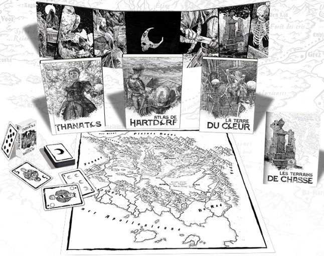 Thanatos est un jeu de rôle de Jean-Yves Pattus. Après une première édition auto-éditée très remarquée, il en propose ici une nouvelle version, révisée avec l’aide de Thibaut Dachy (Mournblade) et développée avec Stéphane Arnier (Thoan, Missions). Les illustrations sont signées Aldo de Silvestri (couvertures, paravent et illustrations principales), Aldwin Henry (paquet de cartes L’Oracle de Hartdörf), Alex Rusu (illustrations secondaires) et Maxime Plasse (portraits) qui a également réalisé les plans et la conception graphique des ouvrages. La gamme complète se compose de trois ouvrages principaux, accompagnés d’un tarot de 53 cartes, de l’écran du meneur et son livret, ainsi que d’une grande carte de Hartdörf :